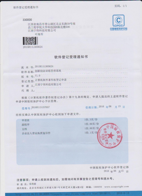 南昌市科技和信息局于2016年06月31日對(duì)我公司的《科研項(xiàng)目管理系統(tǒng)》軟件產(chǎn)品進(jìn)行審核,經(jīng)審核,申報(bào)材料和相關(guān)內(nèi)容符合《鼓勵(lì)軟件產(chǎn)業(yè)和集成電路產(chǎn)業(yè)發(fā)展的若干政策》和《軟件產(chǎn)品管理辦法》的有關(guān)規(guī)定,予以登記并頒發(fā)軟件產(chǎn)品登記證書(shū)。